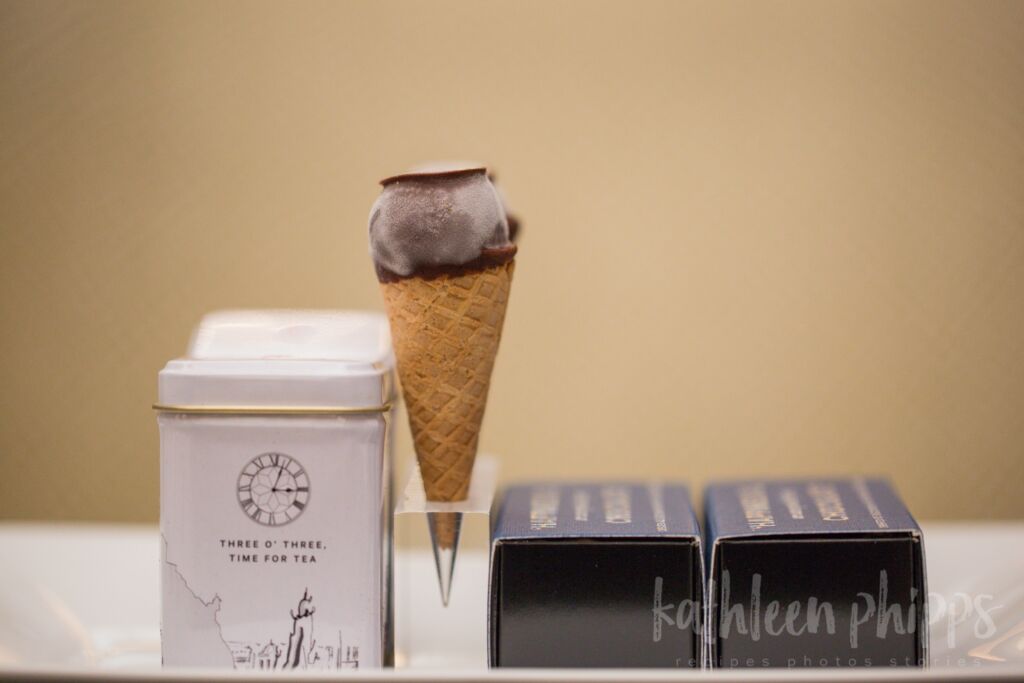 Patricia brought out one final surprise to the table, a very special treat containing a small box of chocolate truffles and pâtes de fruits and two small tins of tea to take home containing the Balmoral’s breakfast blend and the rose petal tisane. As though that wasn’t enough, there was also a small cone of mango sorbet enrobed in dark chocolate, placed in a small plastic stand made especially for this purpose. It was a spectacular ending to a memorable afternoon tea.