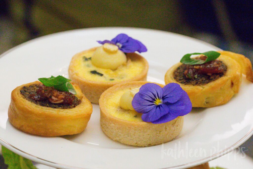 The next course to arrive were the savory treats. On the top tier was a gorgeous plate of savory tarts, decorated with edible flowers. One was filled with a delightfully creamy sweet corn custard, topped with a dollop of brie cheese pastry cream.